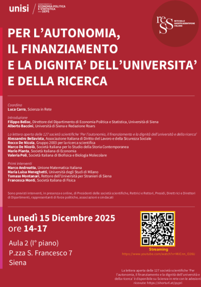 L’incontro, organizzato insieme alla Rete delle Società Scientifiche Italiane (RESS), presenterà la lettera aperta promossa dalla RESS “Per l’autonomia, il finanziamento e la dignità dell’Università e della Ricerca”, sottoscritta finora da 127 Società Scientifiche.