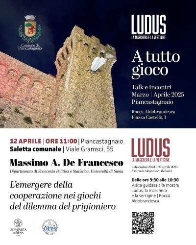 As part of the A tutto gioco/Talk e incontri series, which complements the exhibition LUDUS: LA MASCHERA E LA VERTIGINE at the Rocca Aldobrandesca in Piancastagnaio (SI), we are pleased to announce a lecture by Prof. Massimo A. De Francesco from the University of Siena's Department of Economics and Statistics.