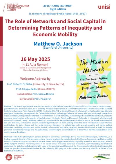 Il Professor Matthew Jackson, docente di Economia presso la Stanford University, studioso riconosciuto a livello internazionale come una delle figure di spicco nell’ambito delle rete economiche e sociali, sarà il 16 maggio 2025 a Siena per tenere una lezione da titolo ”The Role of Networks and Social Capital in Determining Patterns of Inequality and Economic Mobility”.