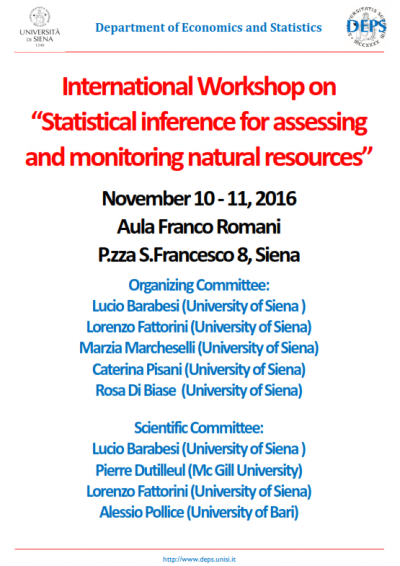The investigation of the environment and connected problems represents a burning issue for current scientific research. The rapid decline of biodiversity at global and local scales, the increase in the number of damaged species and desertification processes due to climate changes, land-use changes and air pollution, the conservation and enhancement of forest carbon stocks paired with the sustainable management of forests and animal populations are solely some of the issues requiring a reliable assessment of environmental indicators, as well as a suitable modeling for explanation and prediction purposes. Assessing and monitoring the effects of environmental variables on plant and animal communities is the core topic of this two-day workshop, with the purpose of proposing, discussing and applying robust and effective statistical tools. In this sense, the aim of the workshop is to gather environmental statisticians and quantitative naturalists from Italy and abroad in order to argue about the proposed methodological advances as well as about application of previously-established methodologies.