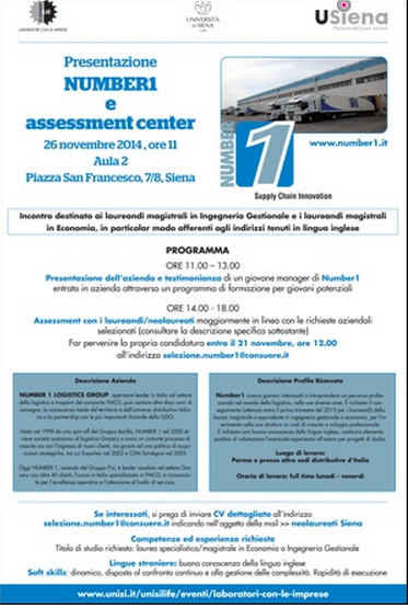 Candidature entro il 21 novembre (ore 12.00) a: selezione.number1@consuere.it (indicare nell'oggetto della mail "neolaureati Siena")