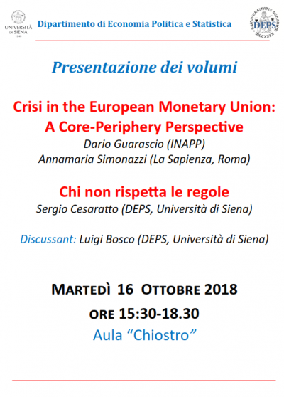 Presentazione dei volumi "Crisis in the European Monetary Union: A Core-Periphery Perspective" Dario Guarascio (INAPP) Annamaria Simonazzi (La Sapienza, Roma) & "Chi non rispetta le regole" Sergio Cesaratto (DEPS, Università di Siena)