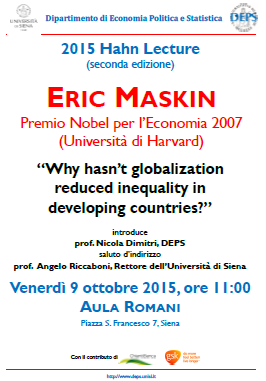 Il Dipartimento di Economia Politica e Statistica (DEPS) è particolarmente lieto di annunciare che la Seconda Hahn Lecture, in memoria del Prof. Frank Hahn (1925-2013), è stata tenuta il giorno 9 ottobre 2015 dal Premio Nobel per l'Economia 2007, prof. Eric Maskin.